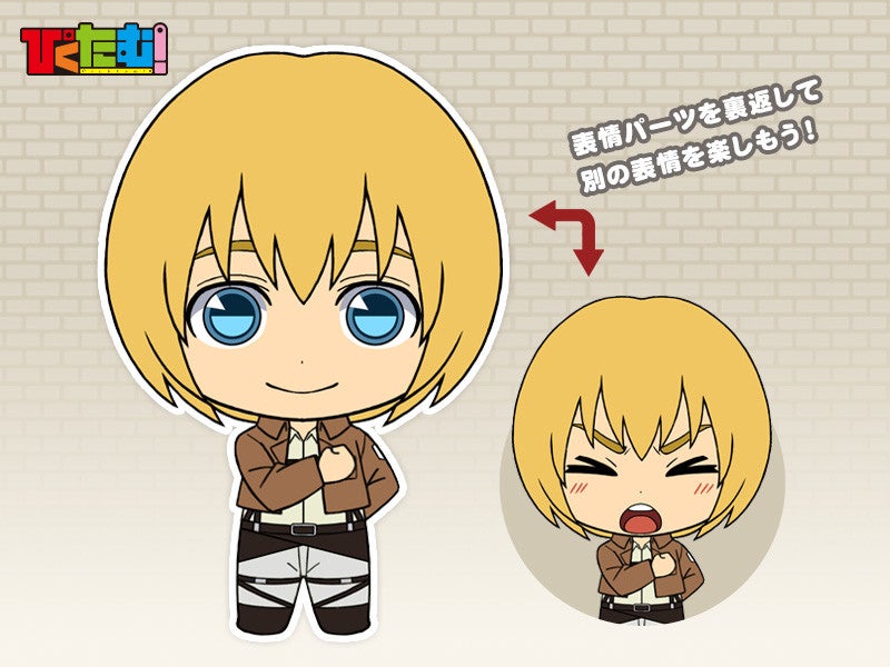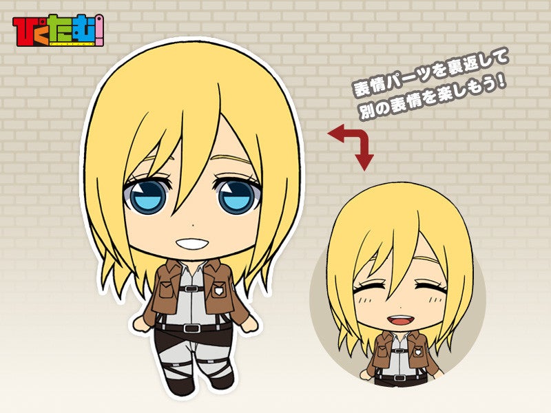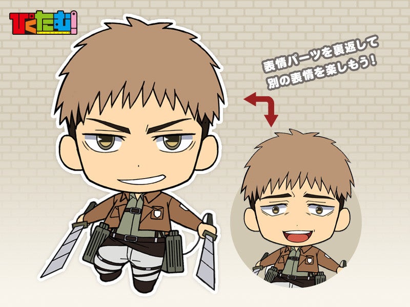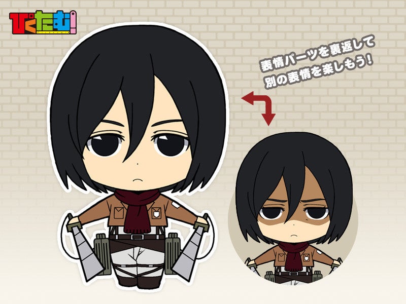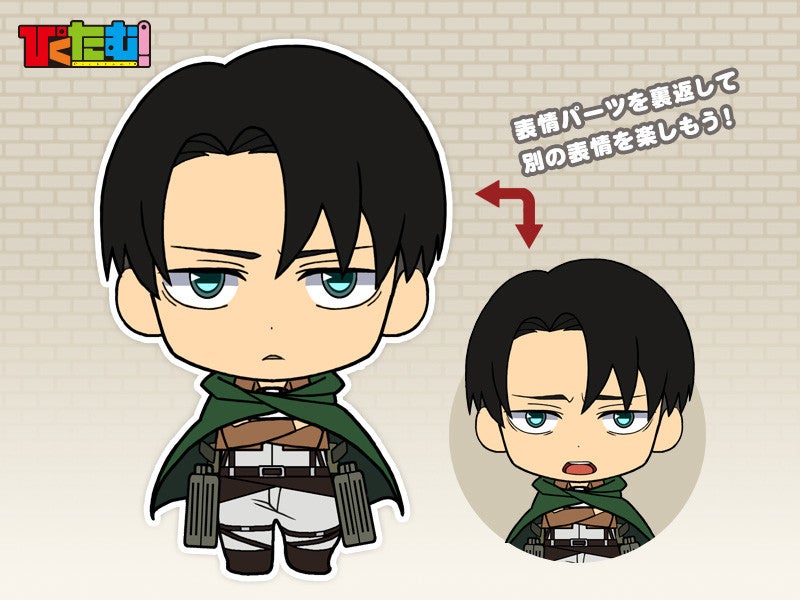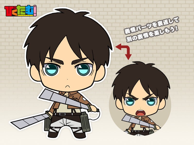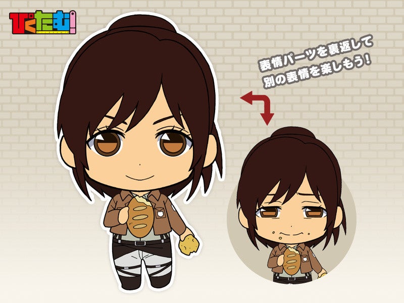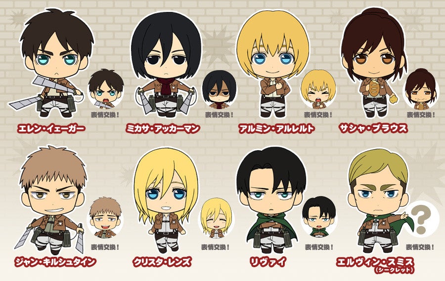 The set features eight characters including Eren Yeager, Mikasa Ackerman, Armin Arlert, Levi, Sasha Braus, Jean Kirschtein, Christa Renz and one secret character! Each character's face part had two sides each with a different expression, allowing you to pick the one that suits your mood best each day!