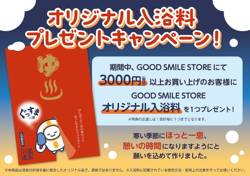 期間中、GOOD SMILE STOREにて3,000円(税込)以上お買い上げのお客様に、GOOD SMILE STOREオリジナル入浴料を1つプレゼント!