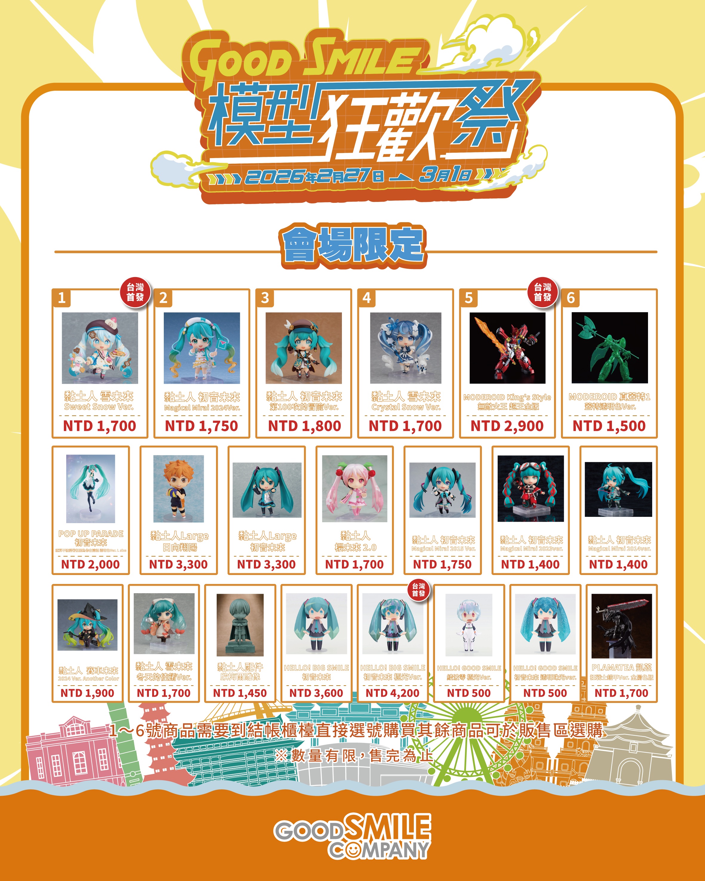 - 「黏土人 雪未來 Sweet Snow Ver.」每人限購3個;「MODEROID King’s Style 無敵火王 超王金版」每人限購2個。此兩款商品每日皆為限量販售。