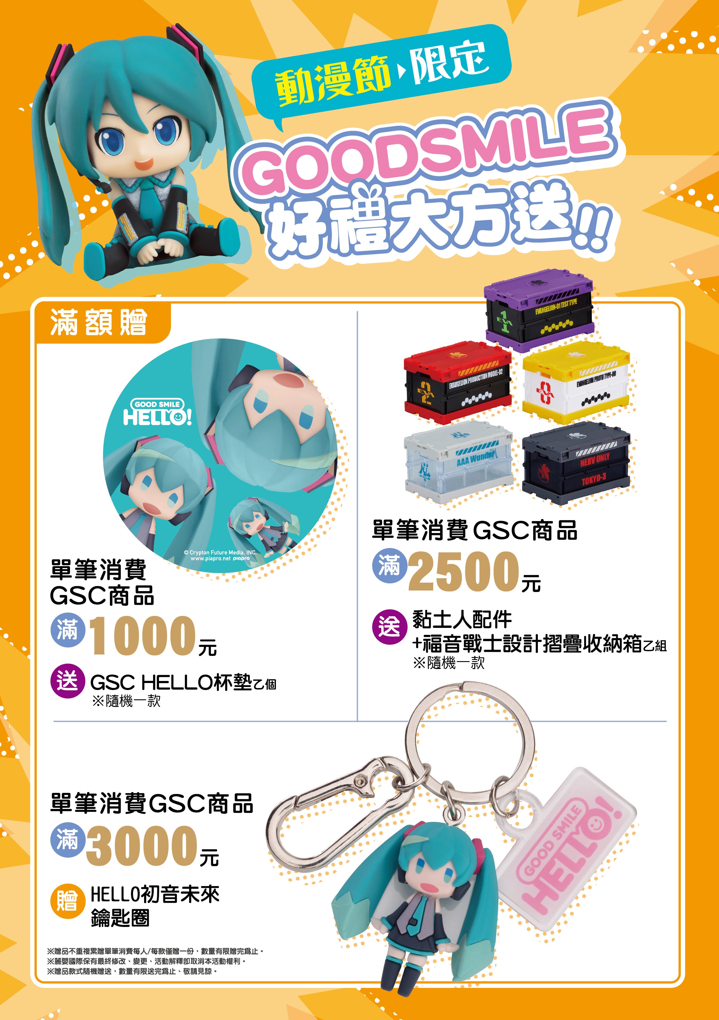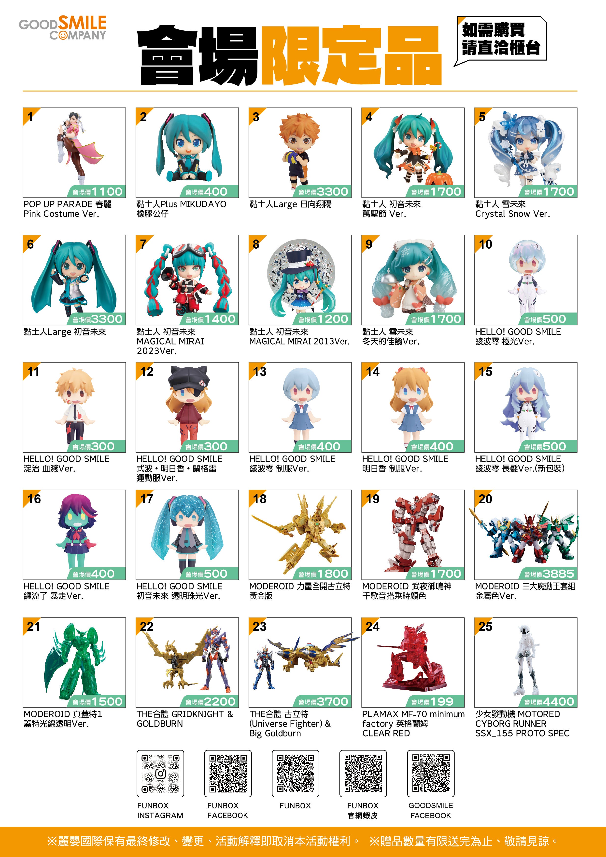 本次活動將推出眾多熱門商品與最新話題商品!包含可愛Q版風格的「黏土人」與「HELLO! GOOD SMILE」、擁有豐富陣容與多元規格的「POP UP PARADE」,以及組裝模型系列「MODEROID」等。會場還有購物好禮等你帶回家,模型玩家絕對不能錯過!