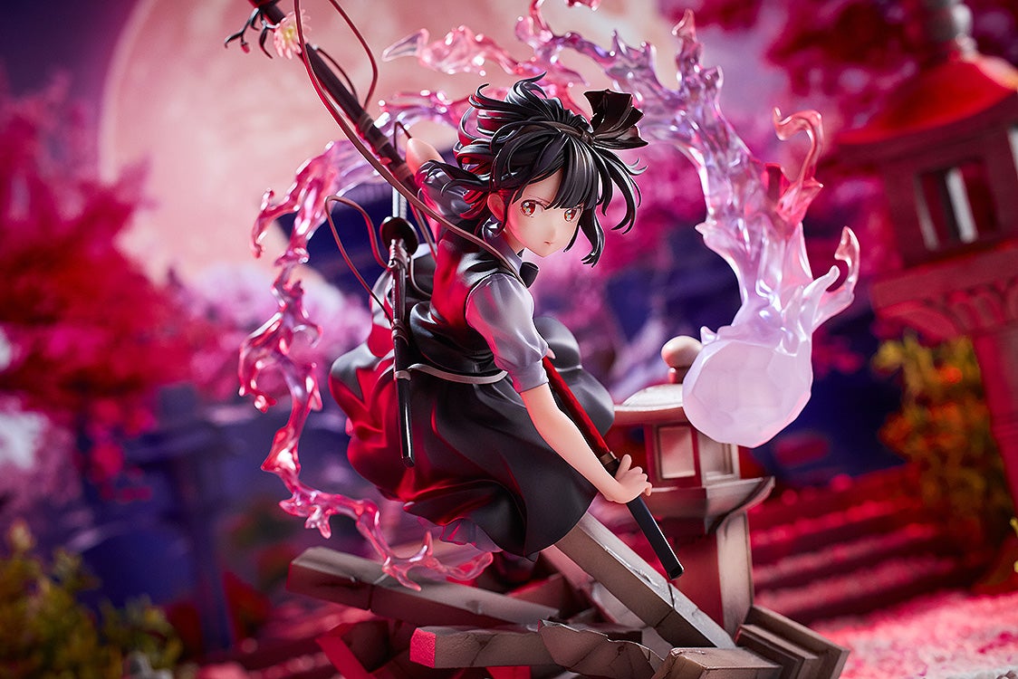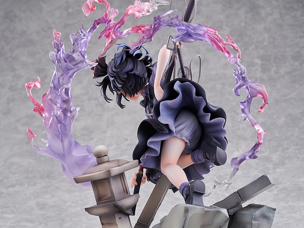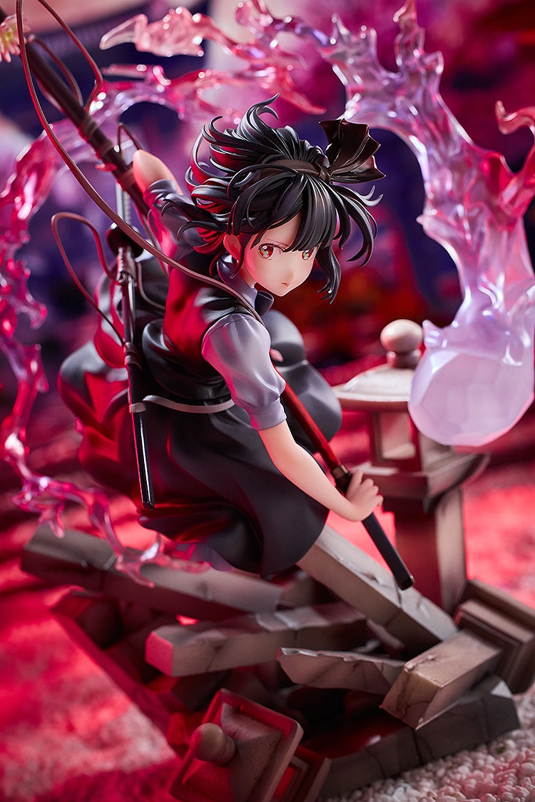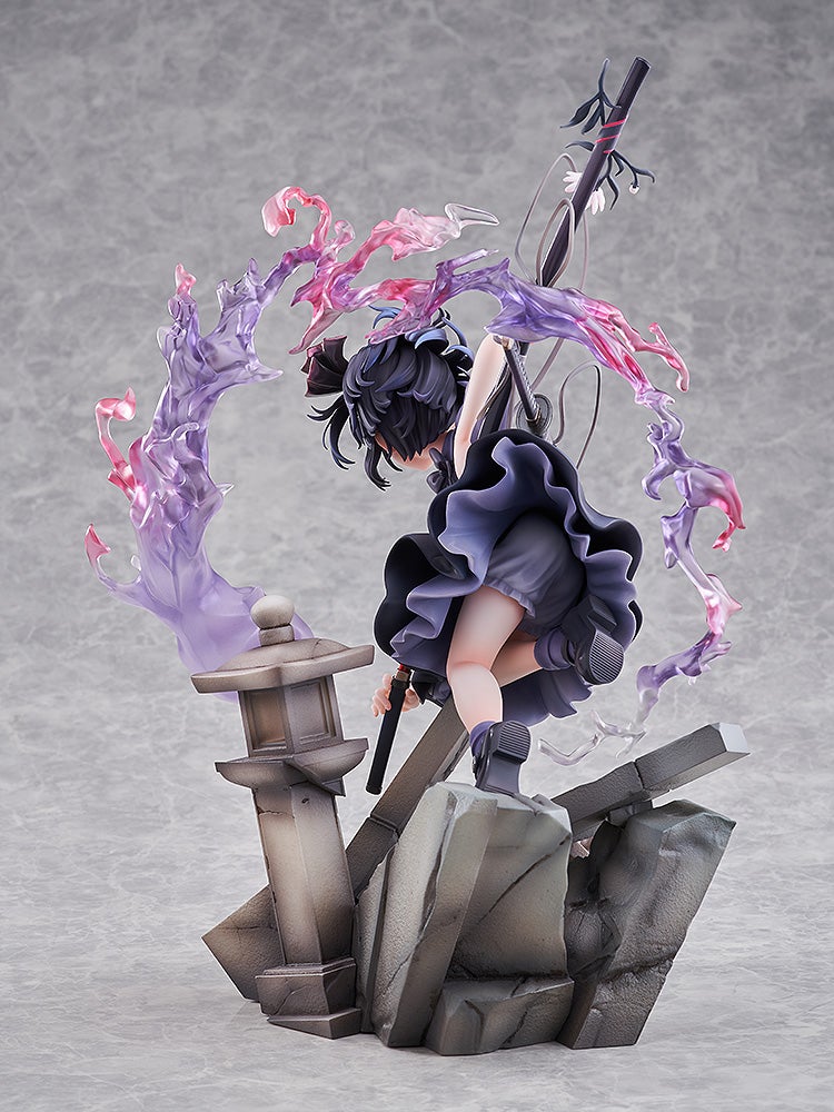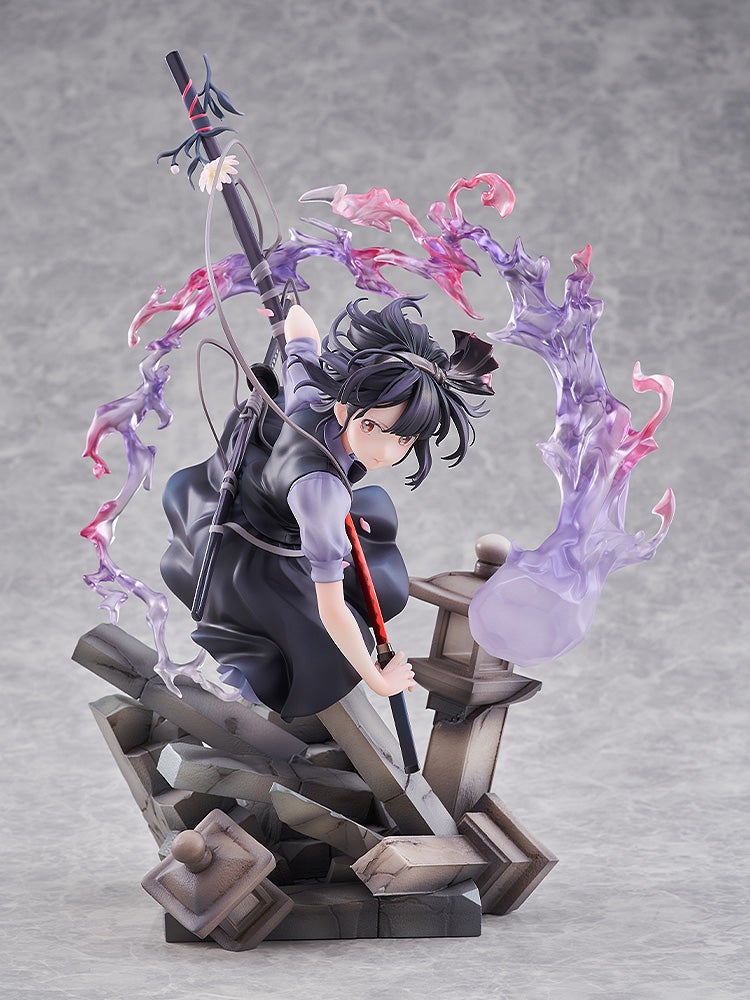 出自《東方Project》,魂魄妖夢以全新裝扮作為活動限定色登場!繼前作「魂魄妖夢 半分幻的庭師Ver. 」的經典配色之後,本次以紫色與黑色為基調的服裝,散發出神秘且凜然殺氣的姿態。如血般紅艷閃耀的樓觀劍、紫色搖曳的半靈——在血月映照的白玉樓庭園中,剎那的氣息交錯其間。妖夢佇立其中的姿態以震撼的造型重現。隨風飄揚的髮絲、裙襬的動態和髮飾彈跳的瞬間等,每個細節都以精緻的造型與上色表現。台座以冥界白玉樓的石階為設計愾念,打造出彷彿置身於戰鬥中的緊張感與臨場感。敬請將散發全新魅力的妖夢帶回家吧。