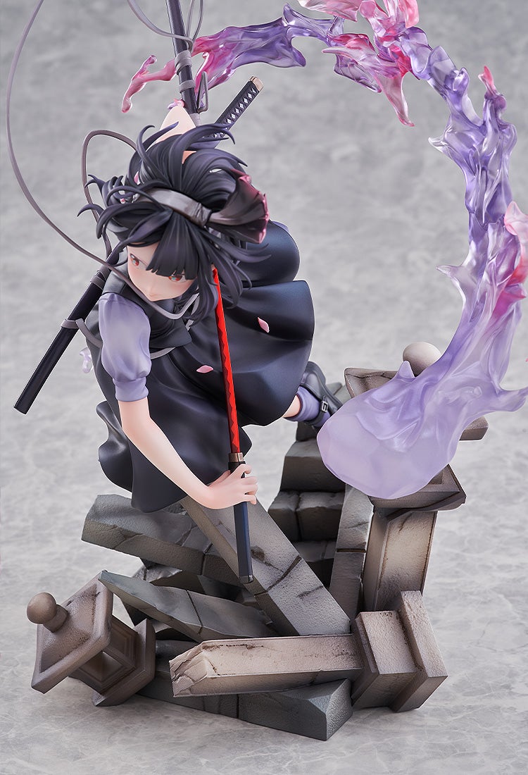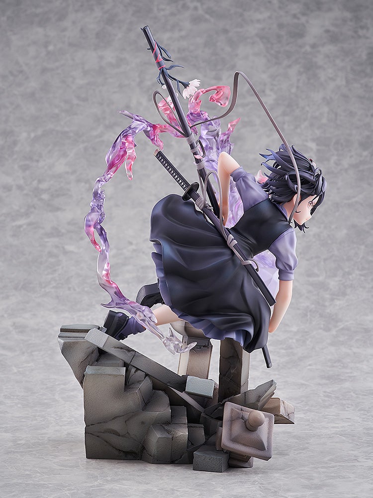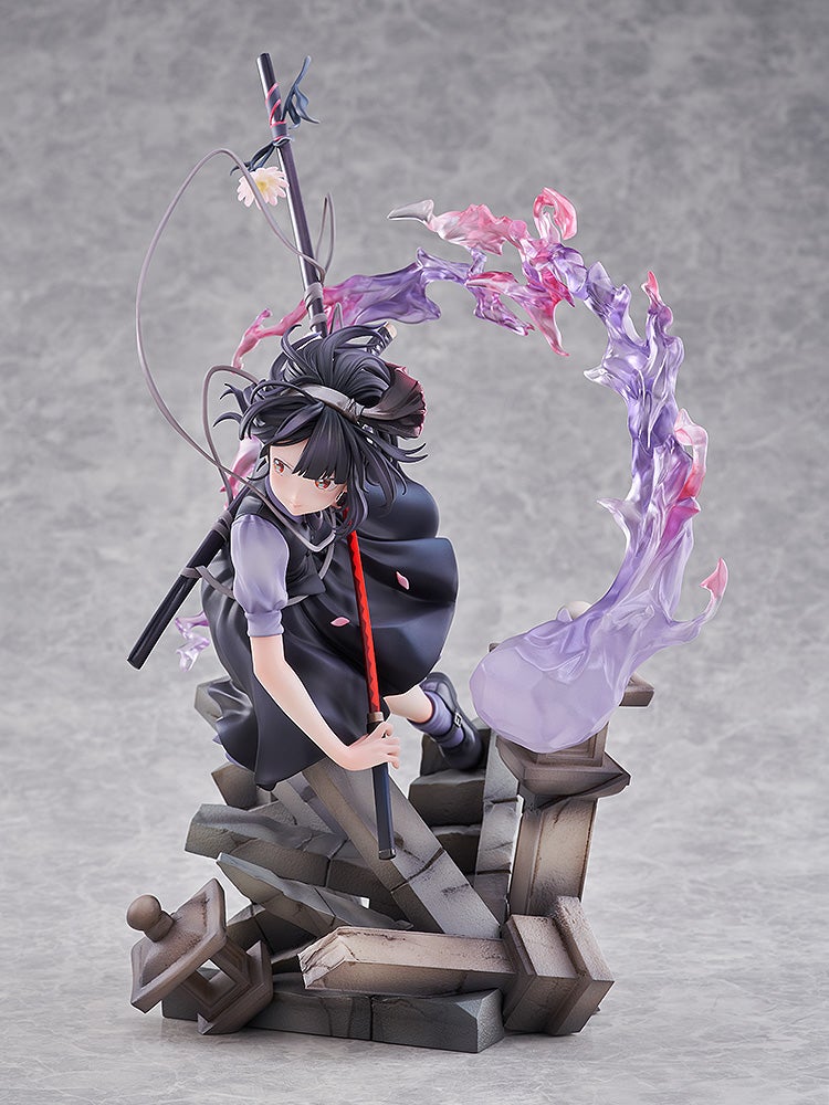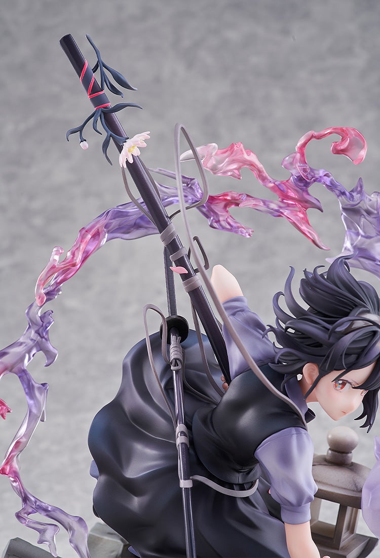 出自《東方Project》,魂魄妖夢以全新裝扮作為活動限定色登場!繼前作「魂魄妖夢 半分幻的庭師Ver. 」的經典配色之後,本次以紫色與黑色為基調的服裝,散發出神秘且凜然殺氣的姿態。如血般紅艷閃耀的樓觀劍、紫色搖曳的半靈——在血月映照的白玉樓庭園中,剎那的氣息交錯其間。妖夢佇立其中的姿態以震撼的造型重現。隨風飄揚的髮絲、裙襬的動態和髮飾彈跳的瞬間等,每個細節都以精緻的造型與上色表現。台座以冥界白玉樓的石階為設計愾念,打造出彷彿置身於戰鬥中的緊張感與臨場感。敬請將散發全新魅力的妖夢帶回家吧。